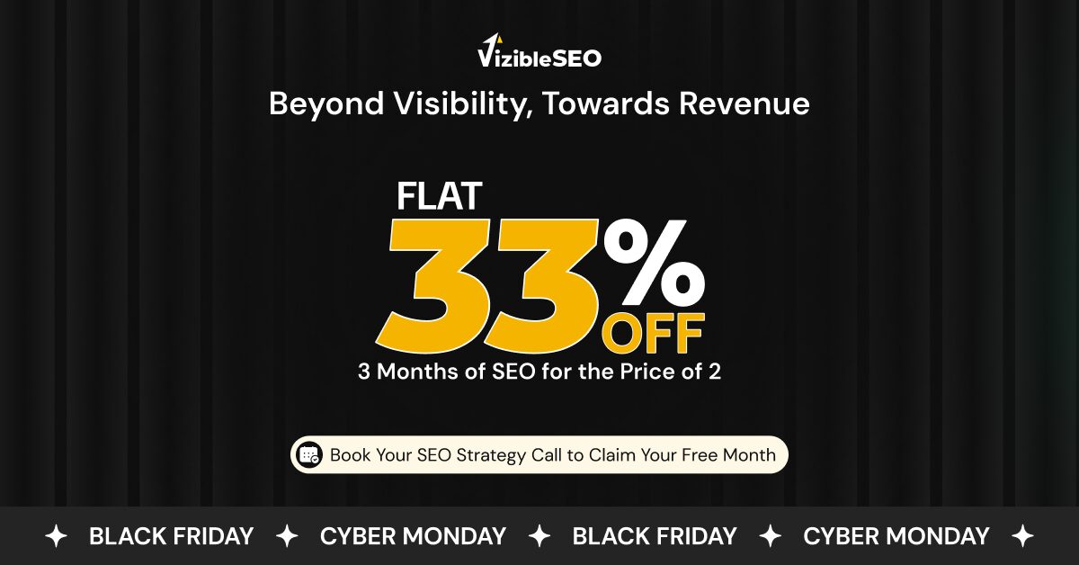 VizibleSEO helps businesses grow through data-driven SEO and content strategies that increase organic traffic and qualified leads. This Black Friday & Cyber Monday, get 3 Months of SEO for the Price of 2 – a flat 33 % OFF on professional SEO services.
